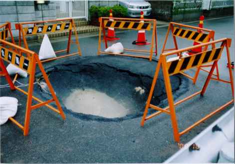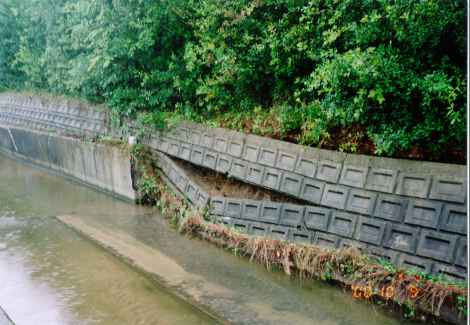 | Extensive liquefacation. Pile supported apartment suffered no structural damaged, but post liquefaction settlement of about 25 cm of surrounding soils caused sewage pipes to break and entrance staircases to be offset. Many one or two story family houses were tilted and had cracked walls. Almost all houses were assigned yellow "cards", meaning people can still remain in the house but should be careful. A green card means that the building suffered no or little damage, while a red card building has to be evacuated. The photos show how the retaining walls along a channel suffered damage due to liquefaction. A Large sinkhole caused by the main shock on friday the 6th had been repaired but the large aftershock on sunday evening caused the same sinkhole again. The doors in the gate were offset some 20 cm. An electric pole settled almost 3 meters (the 1st pole to the right of the pole in the center of the photo). |