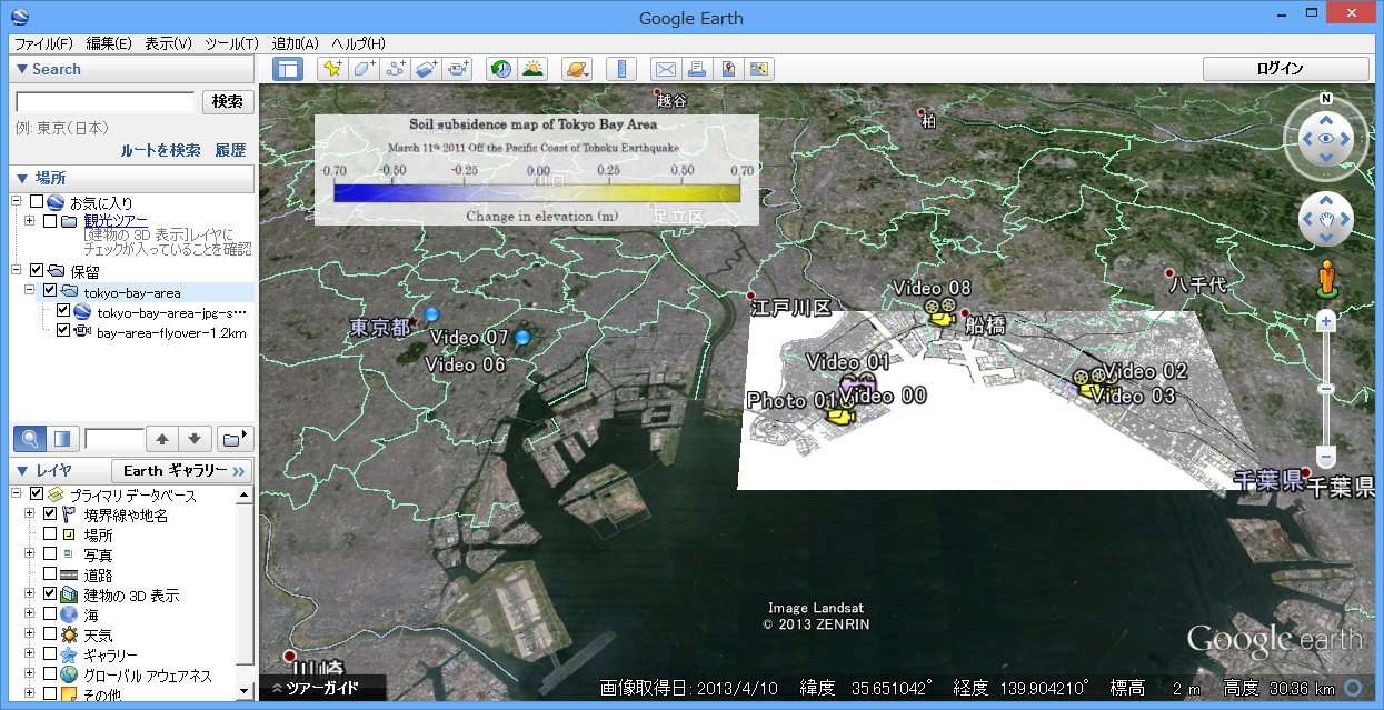 Google EarthはGoogle 社が無料で配布している世界中の衛星写真を、地球儀を回しているかのように閲覧することができるソフトです。このサイトでは2011年東日本大震災で液状化した東京湾岸地域(浦安から千葉市美浜区まで)の沈下マップと、2004年中越地震による地形変動をオーバーレイしたkmzファイルを提供しています。まずこのソフトがお使いのパソコンにインストールされていることが必要です。