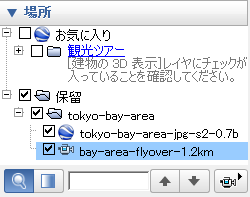 この画面は東京湾岸の沈下マップの初期画面です。 ここで左のサイドバーの「場所」の「保留」に読み込まれた要素の中で「bay-area-flyover-1.2km」というツアーがありますので(下図)、 これをダブルクリックするか、あるいはハイライトした後でツアー再生ボタンを押せば上空のツアーが開始します。 iPadの場合は自動的にツアーがスタートします。